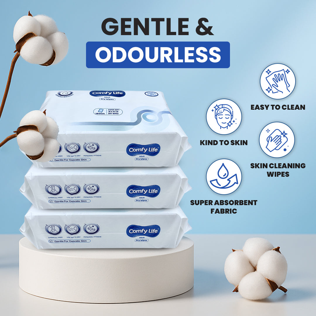 Comfy Life Premium Full Body Cleansing Dry Wipes For Adults - Large Luxury Fresh-feel Rinse-free Fragrance-free Bed Bath Intimate-care Soft Sheets (3 Pack x 100 Wipes)